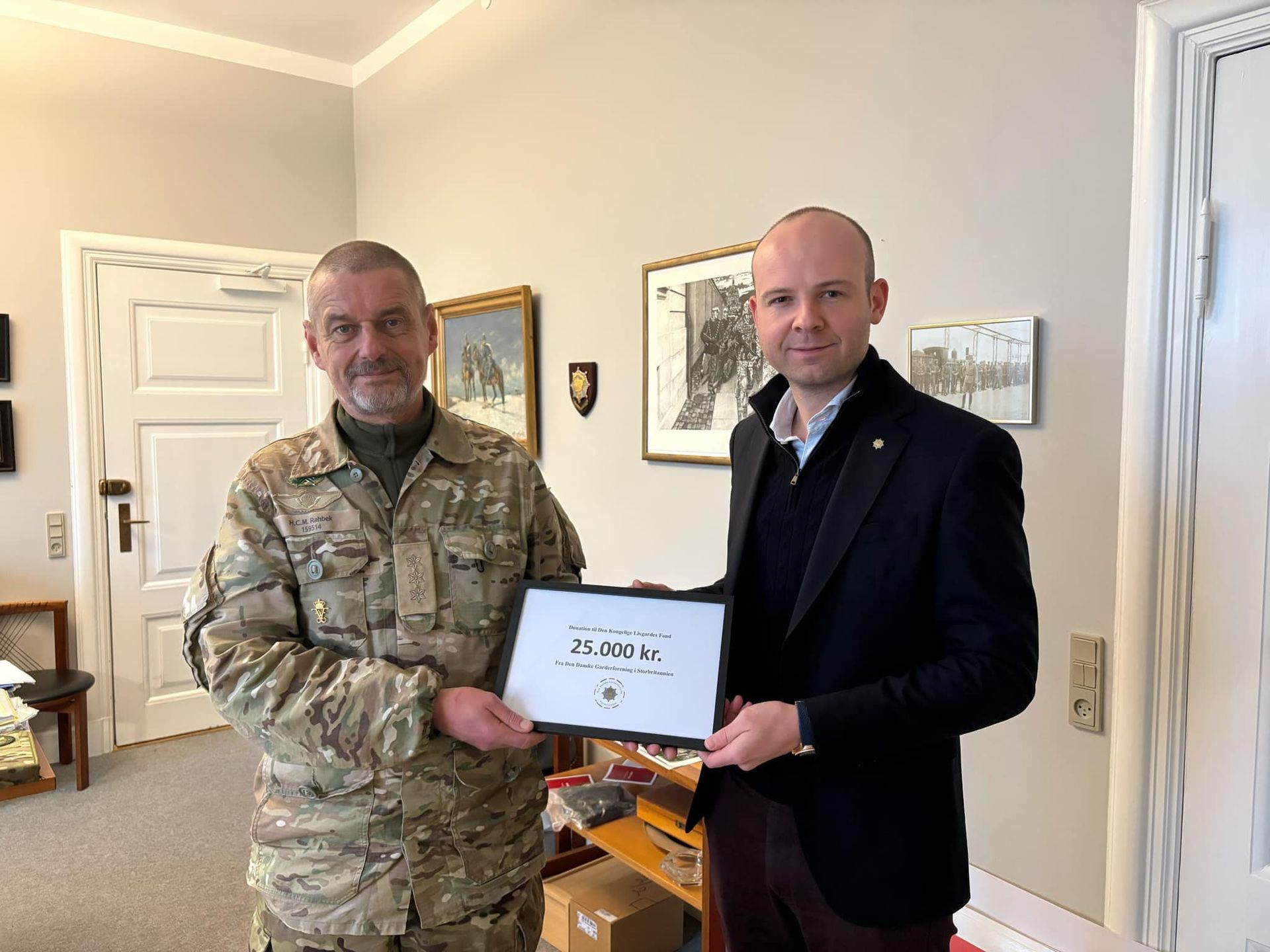 Den Kongelige Livgardes Fond modtog en donation på kr. 25.000 fra Den Danske Garderforening i Storbritannien. Donation blev overrakt til oberst Mads Rahbek af Frederik Klitvad.